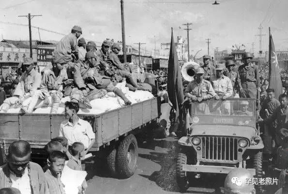 抗战胜利后,新六军是首批进驻南京的中国军队。照片中中国军队雄姿勃发地站在吉普车上胜利开进南京,而擦肩而过的日军则散坐在一辆卡车上落寞地看着庆祝胜利的人群。