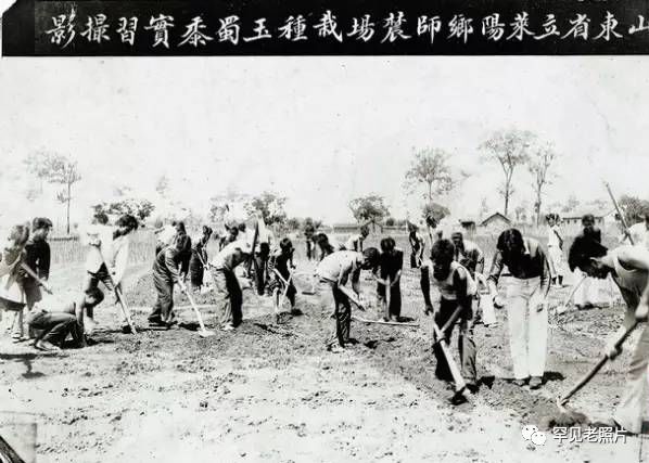 1930年,山东省立第二乡村师范学校成立,1934年2月易名为山东省立莱阳简易乡村师范学校,七七事变后停办。图为乡师学生在农场种植玉米。