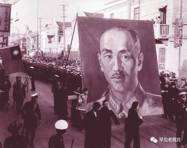 蒋介石画像赫然出现在游行队伍中。经过“训政”教育,对领袖的个人崇拜,于此可见一斑。