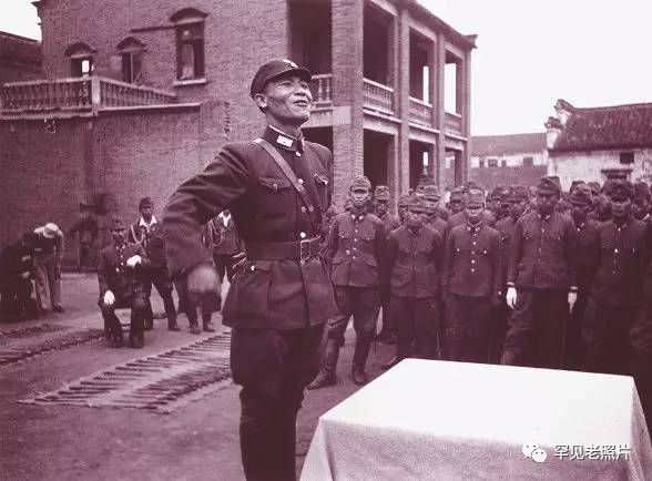 1945年9月,中国第三方面军高级参谋曹大中视察芜湖日军集中地,向放下武器的日军官兵训话。