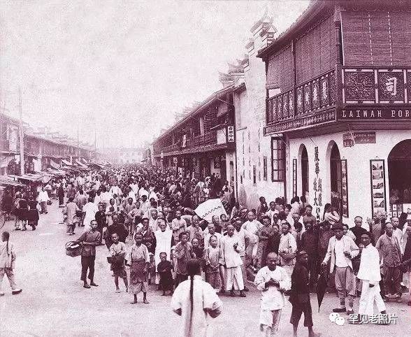 晚清时代,刚刚开埠不久的上海南京路,前景是一所照相馆,远近的人都在恬然地面对着眼前的摄影机。