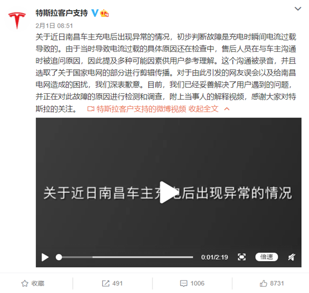 2月1日,@特斯拉客户支持 发布微博称,售后人员与车主的沟通 “被录音,并且选取关于国家电网的部分进行剪辑传播。对于由此引发的网友误会以及给南昌电网造成的困扰,我们深表歉意。”