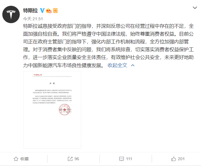 对于被约谈一事,特斯拉在8日晚间火速发布声明称:“诚恳接受政府部门的指导,并深刻反思公司在经营过程中存在的不足,全面加强自检自查。”同时,对于消费者集中反映的问题,将系统排查,切实落实消费者权益保护工作。