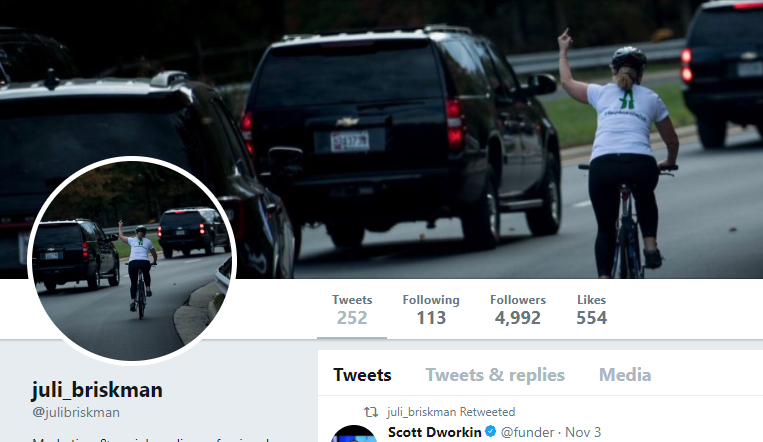 图上的人叫Juli Briskman,来自美国弗吉尼亚。