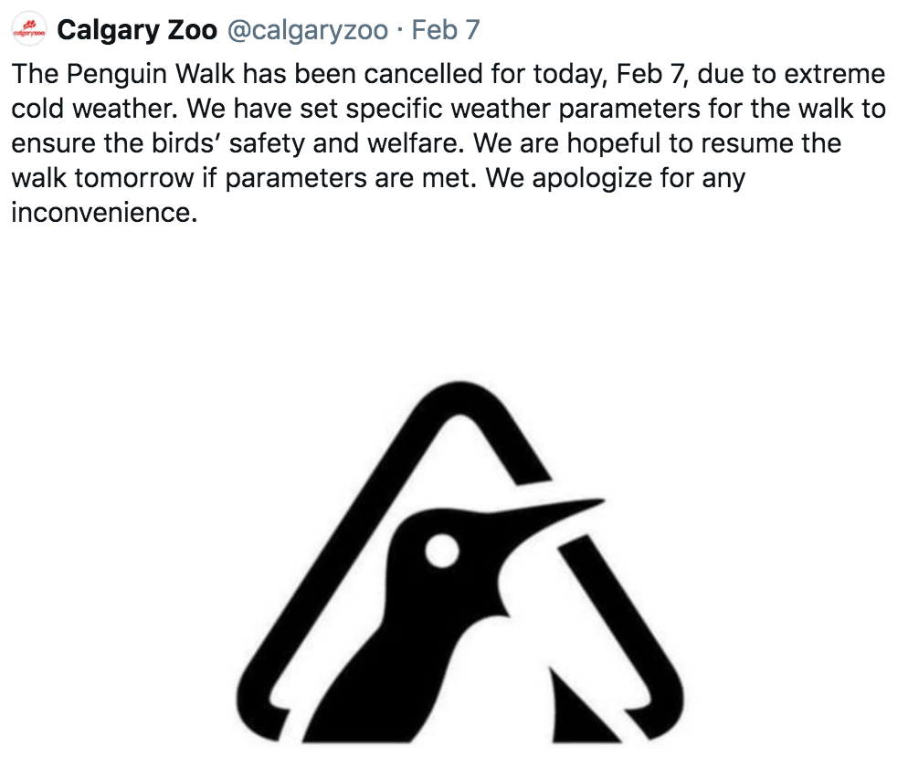 卡尔加里动物园星期天宣布:因为天气太冷了,所以今年的企鹅竞走取消了……