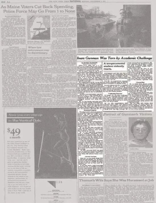 在生物系大楼他没有找到他的“射击目标”之后,他又冲到大学行政大楼,推开副校长安妮克黎利女土的办公室,朝她胸前和太阳穴连射两枪。