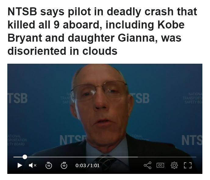 中新网2月10日电 据外媒报道,美国国家运输安全委员会(NTSB)于当地时间2月9日公布了科比空难调查结果,调查表示飞行员阿拉-佐巴扬(Ara Zobayan)在坠机前做了一个飞入云层的错误决定。NTSB对于这一决定提出了批评,并表示飞行员违反了相关飞行标准。