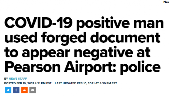 而且就算加拿大现在强推“疫苗护照”,加拿大人没有各位想象的那样民风淳朴。比如,City News 2月10日就报道,一个感染了新冠的大哥试图使用伪造的阴性新冠检测证明,从多伦多皮尔森机场入境。幸亏被警方逮了个正着。