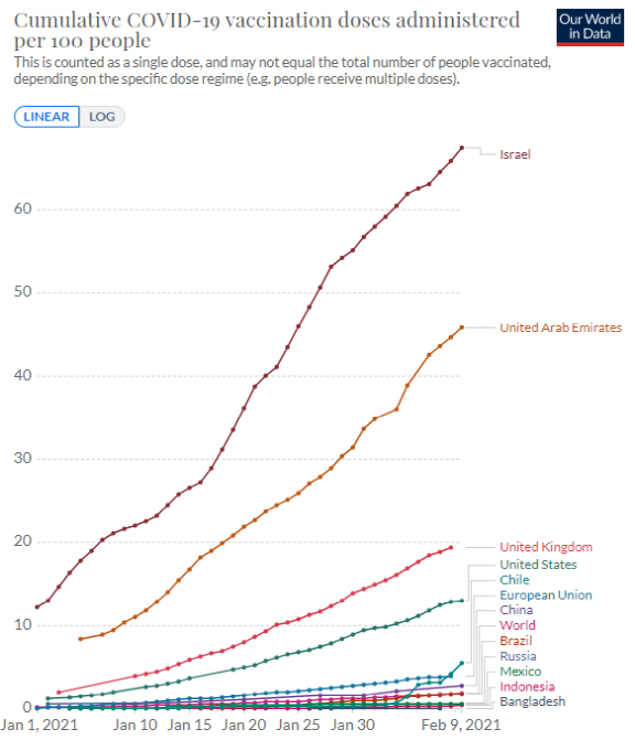 (截至2月10日,以色列的疫苗接种人口占比已达到惊人的67% 图自牛津大学 Our World in Data)