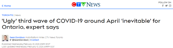 更何况,加拿大传染病流行病学家2月10日还发了警告,表示2021年4月左右,加拿大将迎来第三波“丑陋的”(ugly)疫情高峰,届时诸如安大略省等加拿大重要地区将陷入第三次封城。