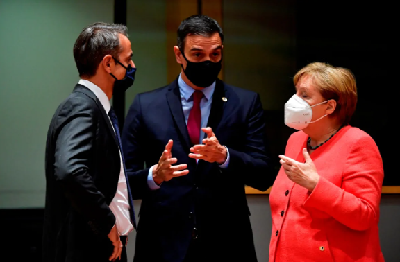 (希腊总理基里亚科斯·米索塔基斯、西班牙总理佩德罗·桑切斯和德国总理安吉丽娜·默克尔 图自CBC)