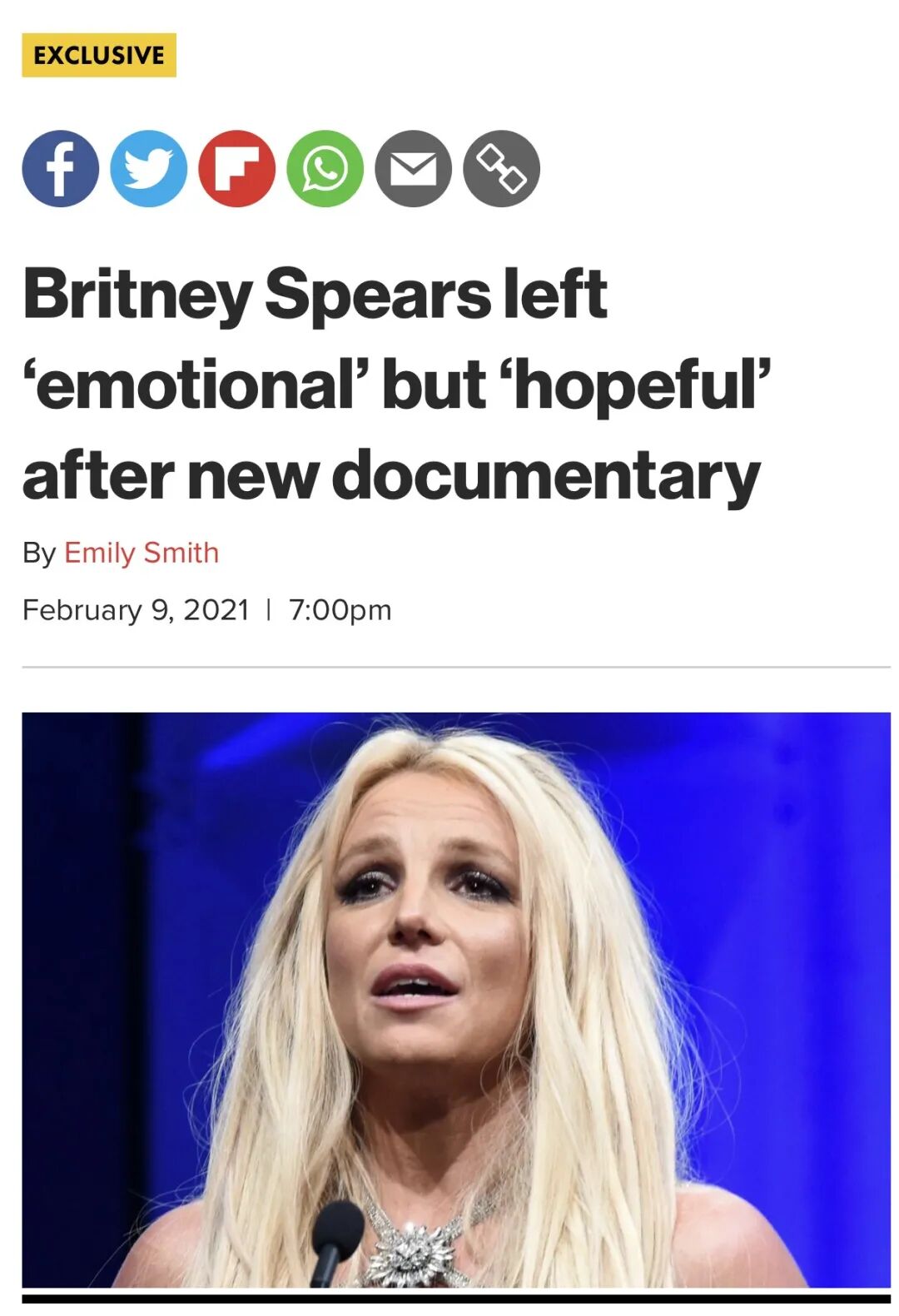 其实,布兰妮自己也看了这部关于自己的纪录片。她看完后情绪激动,但同时她也重燃了“自己最终能从父亲恶毒控制中解脱出来”的希望。