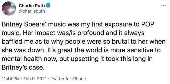 Puth:我最初接触到的pop音乐就是布兰妮的音乐作品。她在流行乐上的影响不管在过去还是现在,都是非常深远的。我一直不能理解为什么人们要在她情绪低迷时这样残忍地对待她。现在全世界都越来越关注人们的心理健康,这是很好的,但对于布兰妮来说,她却等了这么久。