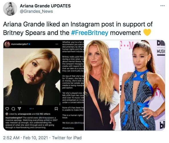 欧美超人气小天后“A妹”Ariana Grande点赞有关“解救布兰妮”的内容以支持她。