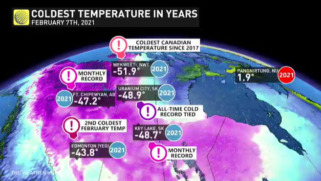 Nunavut的Ennadai Lake地区气温已经达到了零下66摄氏度,下一个是萨斯喀彻温省的Key Lake,达到零下59的低温,阿尔伯塔省的Peace River达到零下55摄氏度,阿尔伯塔省的埃德蒙顿地区达到零下52摄氏度。