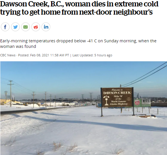 据CBC报道,上周日卑诗省一名女子因从邻居家回家路上被零下41摄氏度的极寒天气冻死。。
