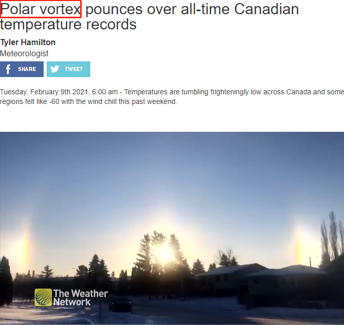 而与此同时,据气象局报道,上周日一个“极地漩涡”现象出现在加拿大西部地区,打破加拿大多年以来极寒记录。