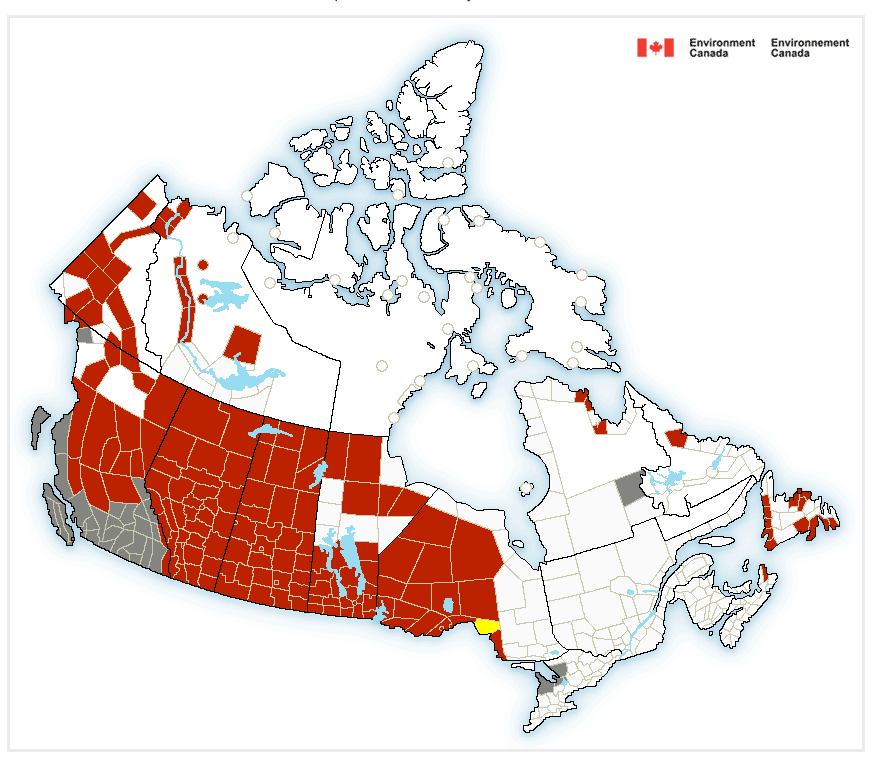 加拿大环境部今天对5个省份发出红色极寒警告,从西面的卑诗省北部一直到安省北部等5个省份均受北极冷空气影响,阿尔伯塔省和萨省更加全省一片红。