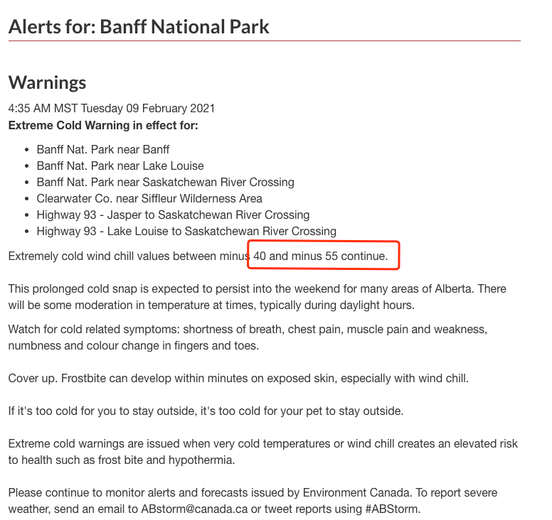 根据天气记录,周日早些时候卑诗省东北部小镇Dawson Creek气温已经降至零下41摄氏度,而整个地区也处于极寒警报中,气温预计将降至零下45度。