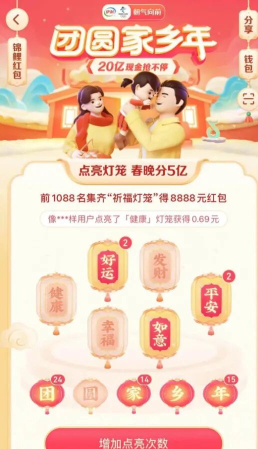 另外比较引人注目的是抖音、快手和百度。抖音的亮点在于再次和春晚合作,作为2021年央视春晚独家红包互动合作伙伴,这是抖音第二次与央视春晚达成合作。2月4日,抖音上线春节红包活动“团圆家乡年”,该活动将共分出20亿元。在除夕当晚,抖音将在春晚直播期间分出12亿元。用户在观看央视春晚时,依据主持人的口令打开抖音操作即可获得红包。而前1088名集齐“祈福灯笼”的用户,可以获得8888元红包。