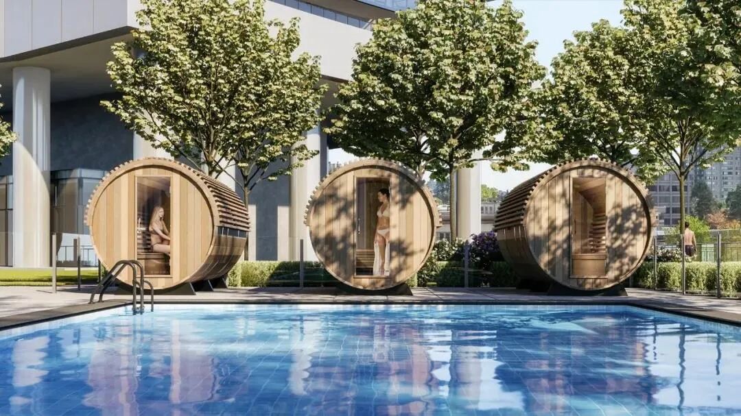 被称为“空中花园”的理由是这座花园崛地三层,环绕整个三栋建筑。花园内不仅有绿地、遛狗公园,更有别致的桶型桑拿房、观景Ofuro水疗,流线型步道、游泳池, 更有一个你怎么也想不到的玻璃温室。