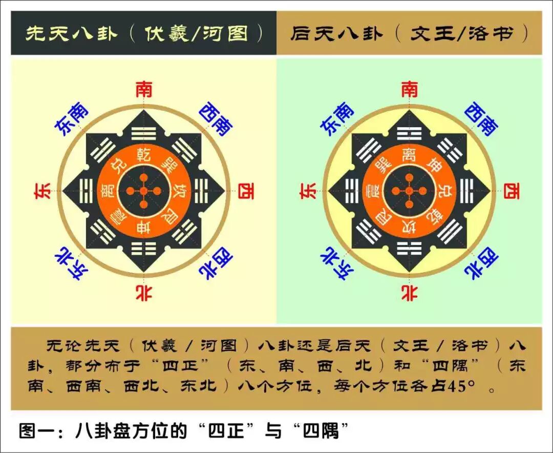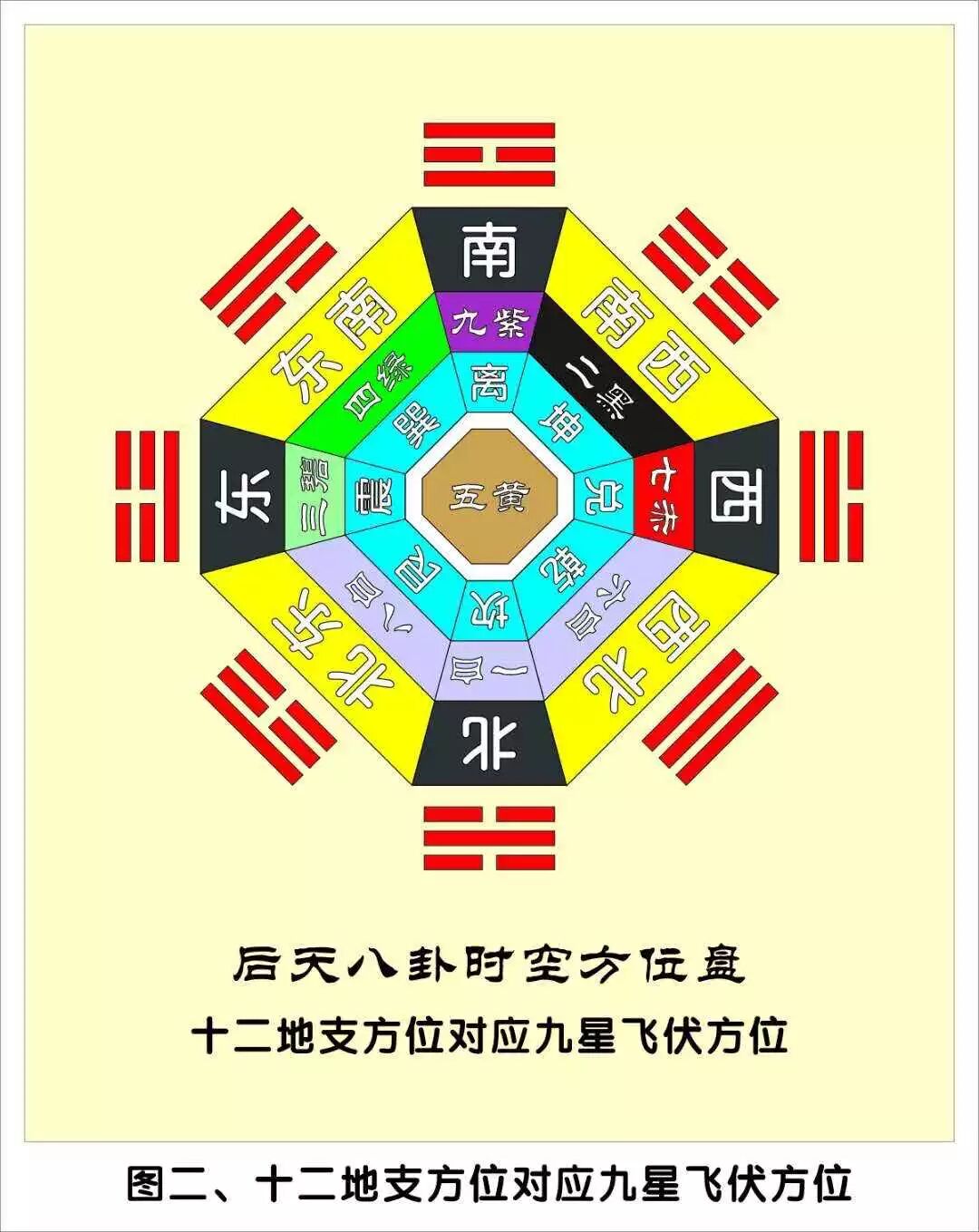 风水专家奕岚认为,风水是讲究方位的,无论是先天(伏羲)八卦还是后天(文王)八卦,排出的都是东、南、西、北(四正)和东南、西南、西北、东北(四隅)八个方位,每个方位各占45°(图一)。但是仅仅靠方位是断不准风水的,一定要引入时间的概念。这样就需要用十二地支与后天八卦盘进行时空整合。后天八卦(洛书)本身就是结合九宫飞星的时空系统,主要体现星宿的时空变化对地球的影响,是宏观的观察。