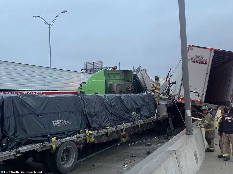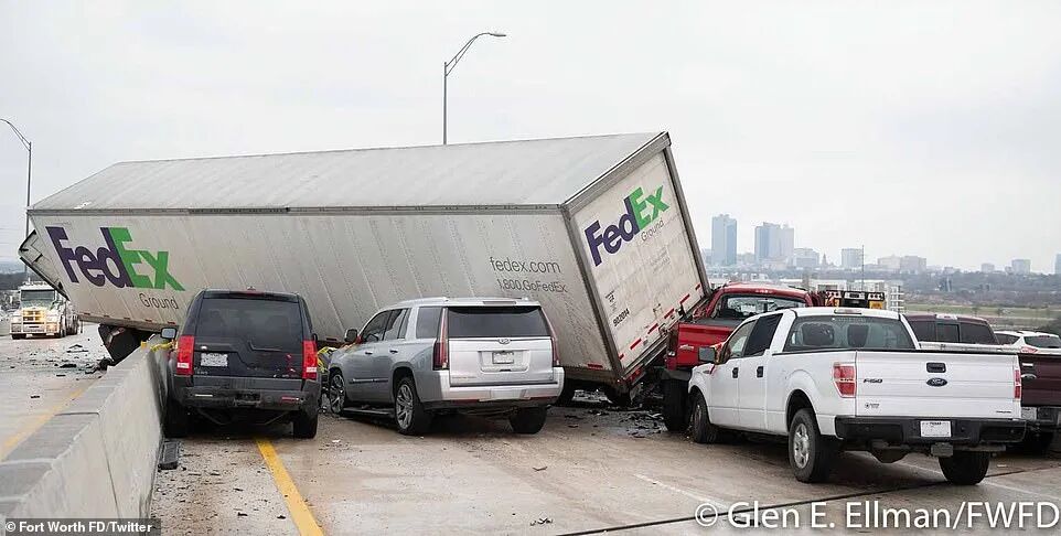 这场悲剧发生在沃斯堡附近的35号州际公路上,令人震惊的现场图片及视频显示,事发时一辆Fedex快递货车在一段结冰的下坡道路上忽然失控,撞上护栏。