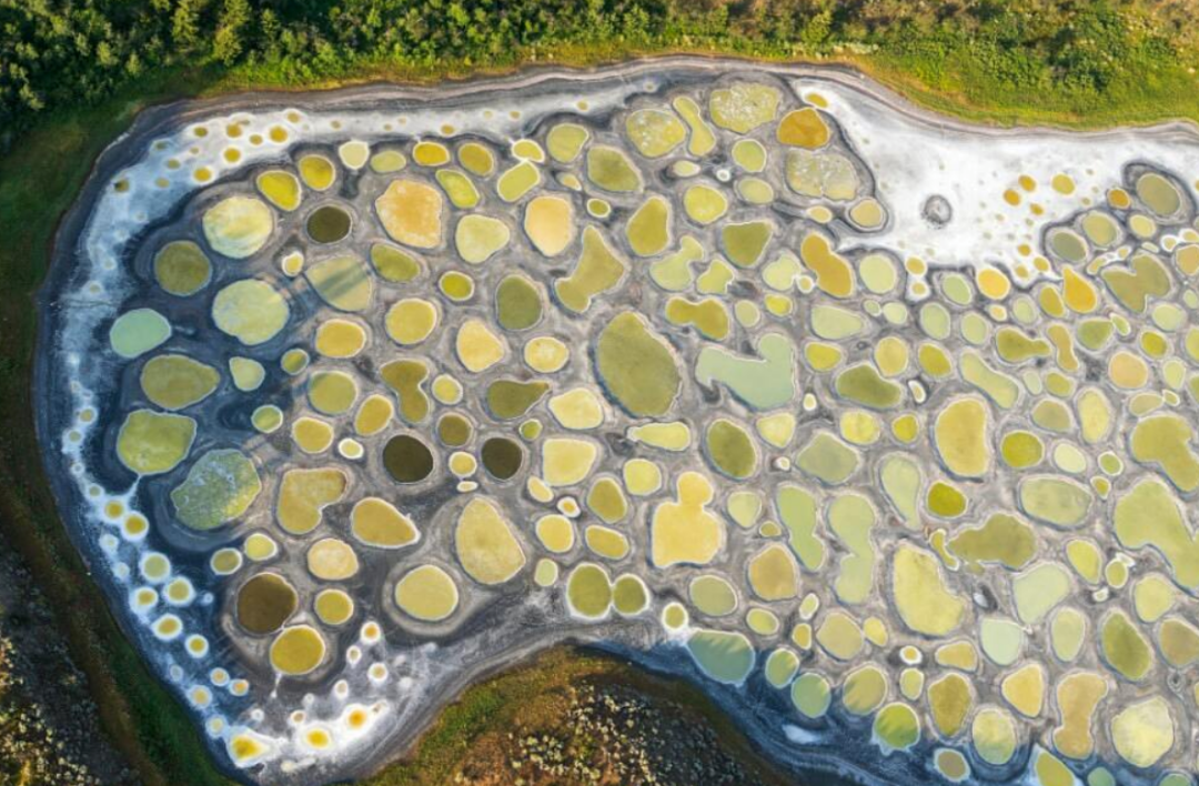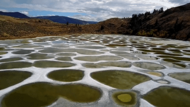 斑点湖在冬天和春天时看上去就像其他湖水一样。但夏季时,随着大部分水开始蒸发,数百个巨大的盐水池被露出,宛若异世界的黄色、绿色、褐色、和蓝色的斑点景观就这样呈现出来。