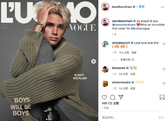 小贝转发了这条消息,并鼓励道:“儿子,为你感到骄傲,第一张封面照就拍的如此出色。”