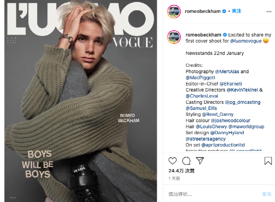 前段时间,罗密欧贝克汉姆在社交媒体上,大方曝出自己为意大利《时尚圣经》 (L”Uomo Vogue)拍摄的封面: