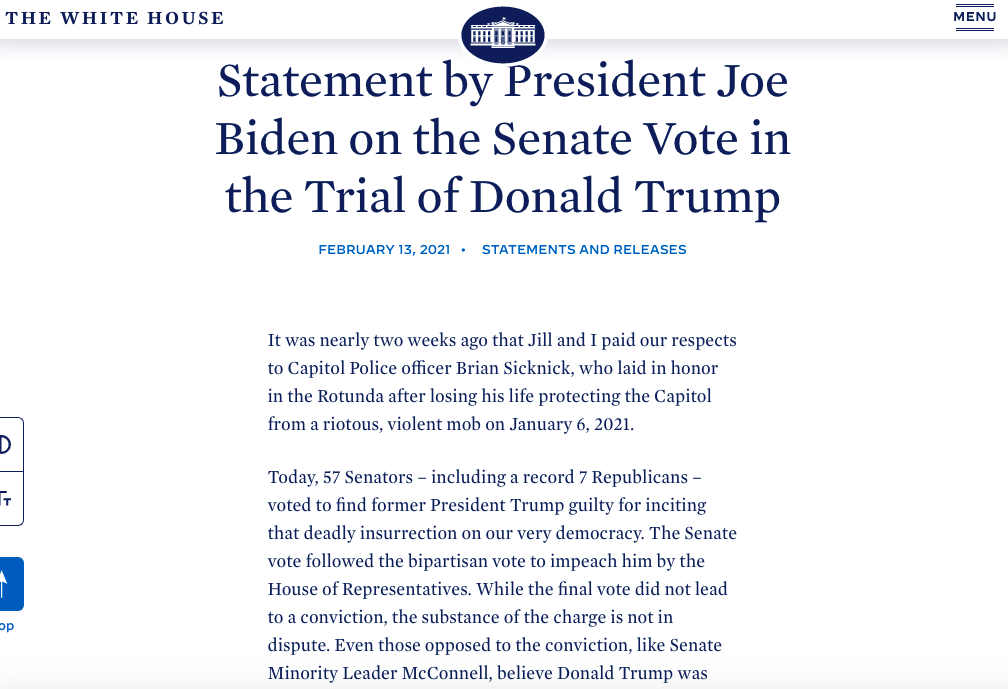 2月13日,弹劾案审理结果出来之后,拜登通过白宫网站发布声明。拜登表示,虽然参议院最终投票结果没有对特朗普定罪,但这项指控的内容是没有争议的。