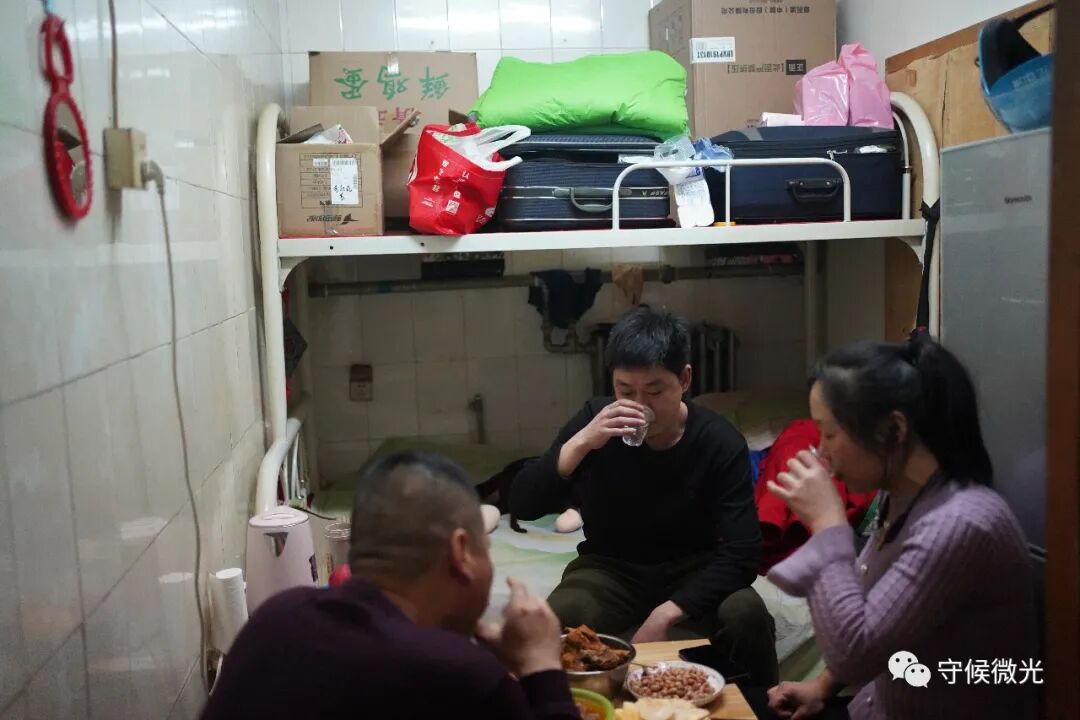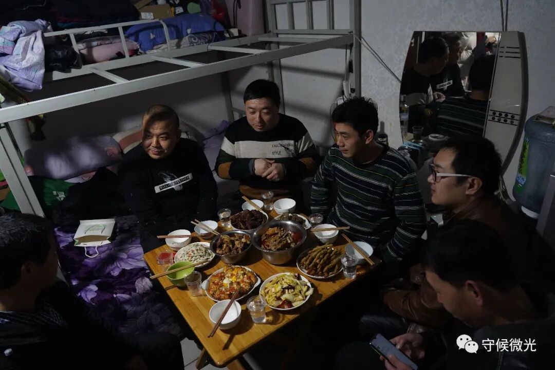 2月11日除夕夜,北京市亮马厂村,六名来自山西同一个村子的外卖员约好晚上10点接完最后一单后,在其中一人的家中吃年夜饭。一名外卖员在下午2点就停止接单,开始准备晚上的大餐。老旗(右一)最先接到了孩子们的拜年电话,之后其他人也纷纷接到了家人的来电。白天他们奔波在外,无暇顾及,晚上10点半到11点是每日固定与家人通话的时间。中青报·中青网记者 王嘉兴/摄