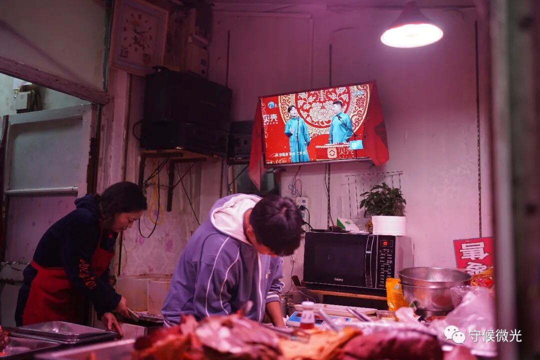 2月11日除夕夜,北京市亮马厂村的一家熟食店仍在营业,店主一边整理肉类,一边通过店内的小电视观看春晚。中青报·中青网记者 王嘉兴/摄