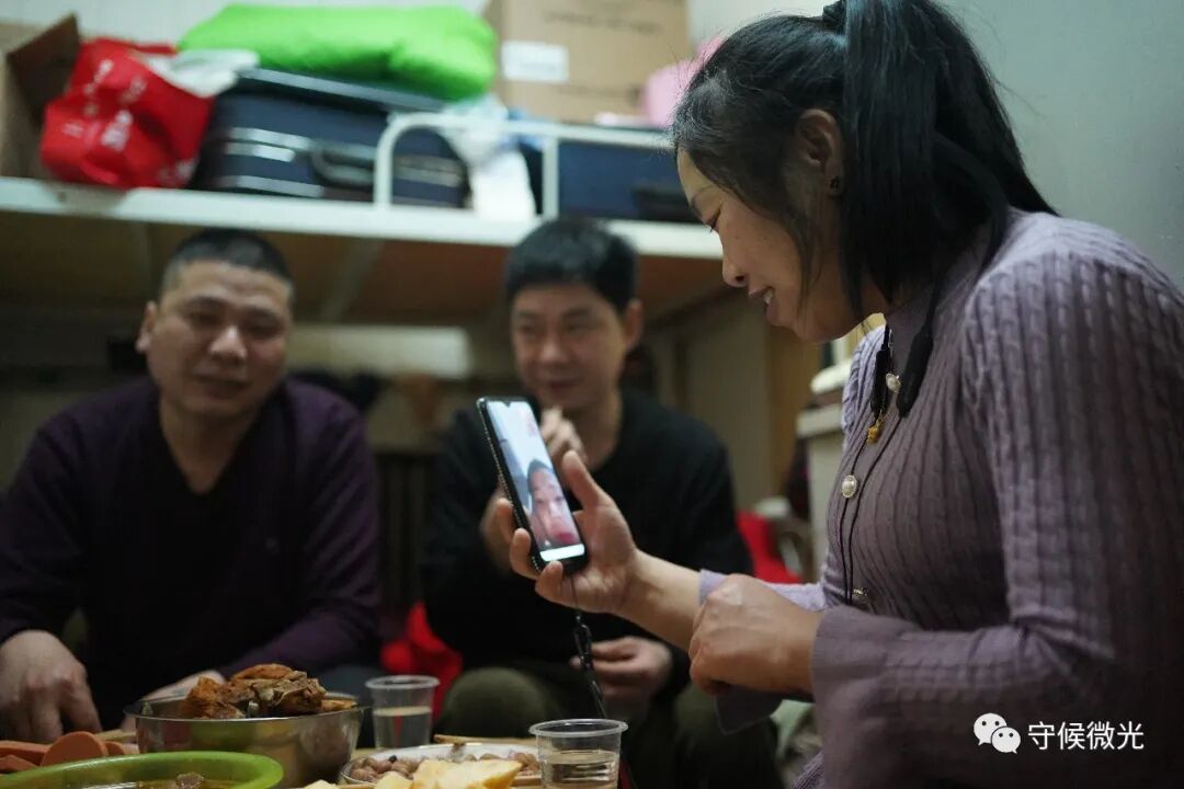 2月11日除夕夜,北京市亮马厂村,外卖员李红玲(右一)和在老家邢台的儿子视频聊天。中青报·中青网记者 王嘉兴/摄