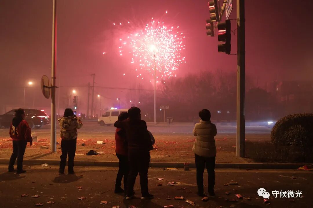 2月12日大年初一凌晨,北京朝阳区孙河乡,人们在马路边观看燃放的烟花。中青报·中青网记者 李隽辉/摄