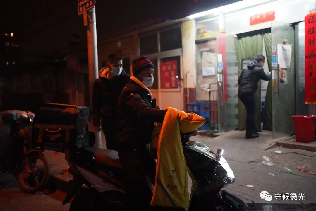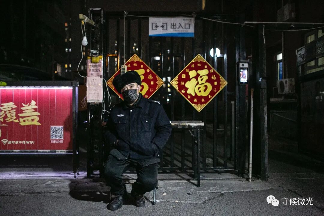 2月11日除夕夜,北京市朝阳区一小区门口,38岁的小区保安姜宝利在值夜班。他来自黑龙江齐齐哈尔,在该小区做保安4年,每年除夕夜都在工作岗位上度过。中青报·中青网记者 曲俊燕/摄