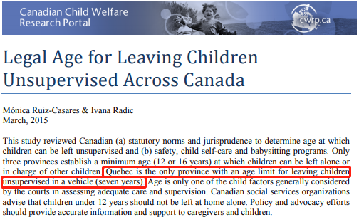 据加拿大儿童福利研究部门(Canadian Child Welfare Research Portal) 2015年的一项研究,加拿大大部分省份都没有对“可被单独留在车里”的儿童做出具体的年龄规定。只有魁北克省规定了——如果警察发现7岁以下的小孩被单独留在车里,警方可以开出60加元的罚单。