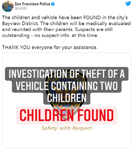 据《华盛顿邮报》报道,旧金山警方在接到报案后即刻发布了安伯警报。在警方和市民的共同努力下,几个小时后,孩子和车全被找到了:孩子安然无恙,车也一点剐蹭也没有——据媒体报道,车上的两个孩子在被“绑架”期间全程都在睡觉,一睁眼就看到自己被警察叔叔围了严严实实……