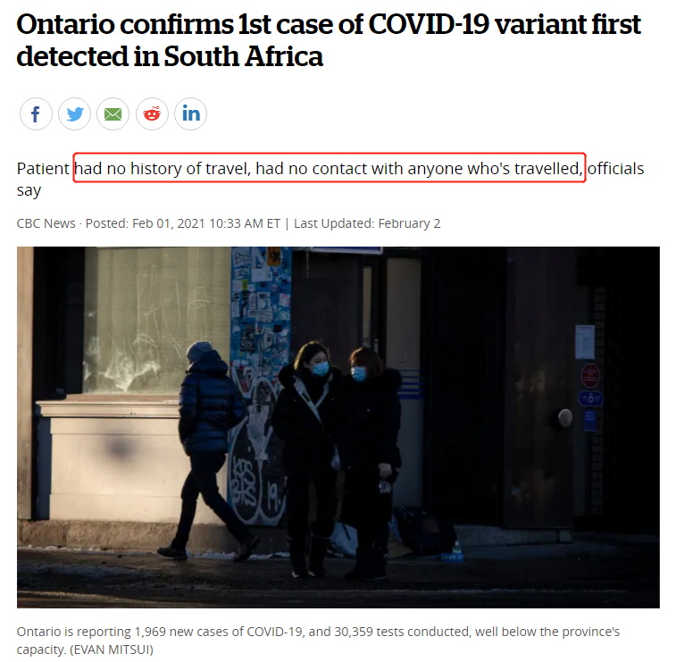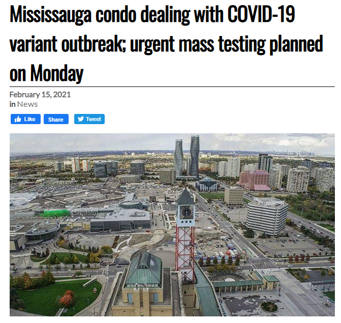 据CBC报道,皮尔区卫生部(Peel Public Health)昨天(2月14日)晚上发布声明中,说该区发现了5例最先在南非发现变种冠状病毒。情况相当令人担忧。今天(2月15日)将对密西沙加一栋Condo公寓所有(无一例外)居民进行测试。