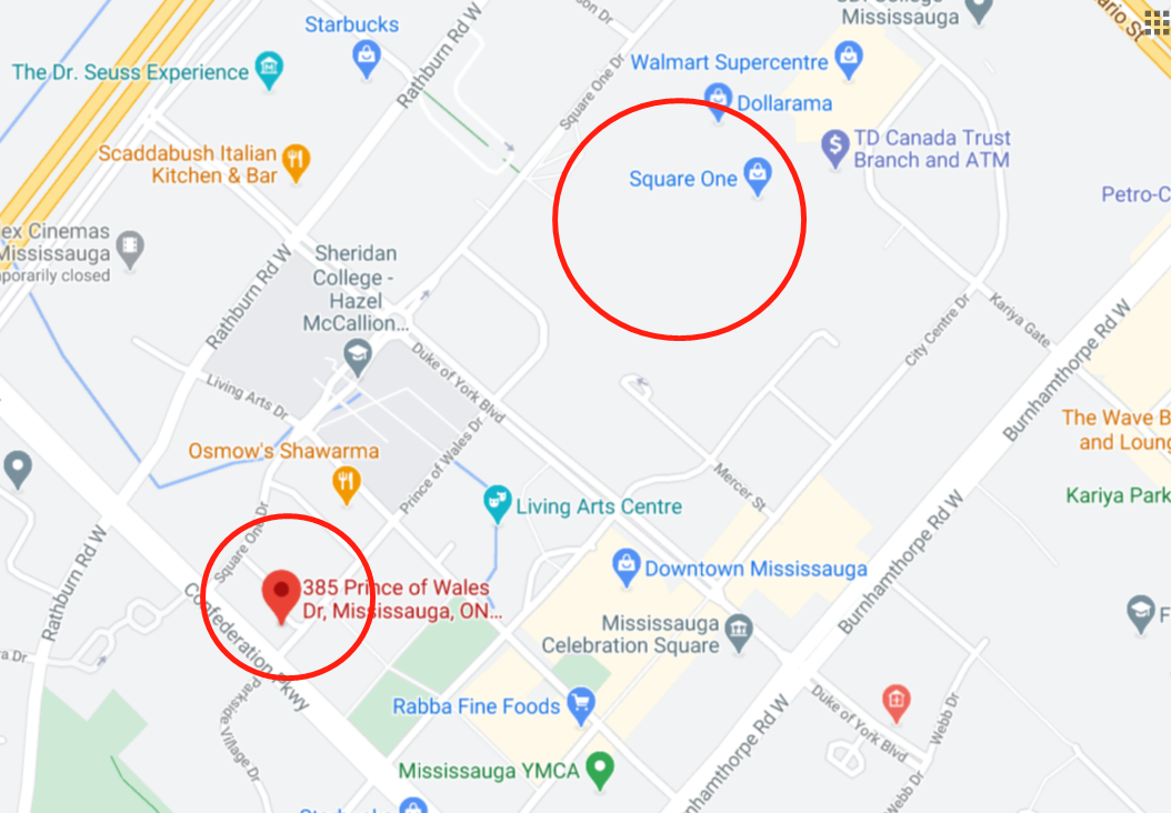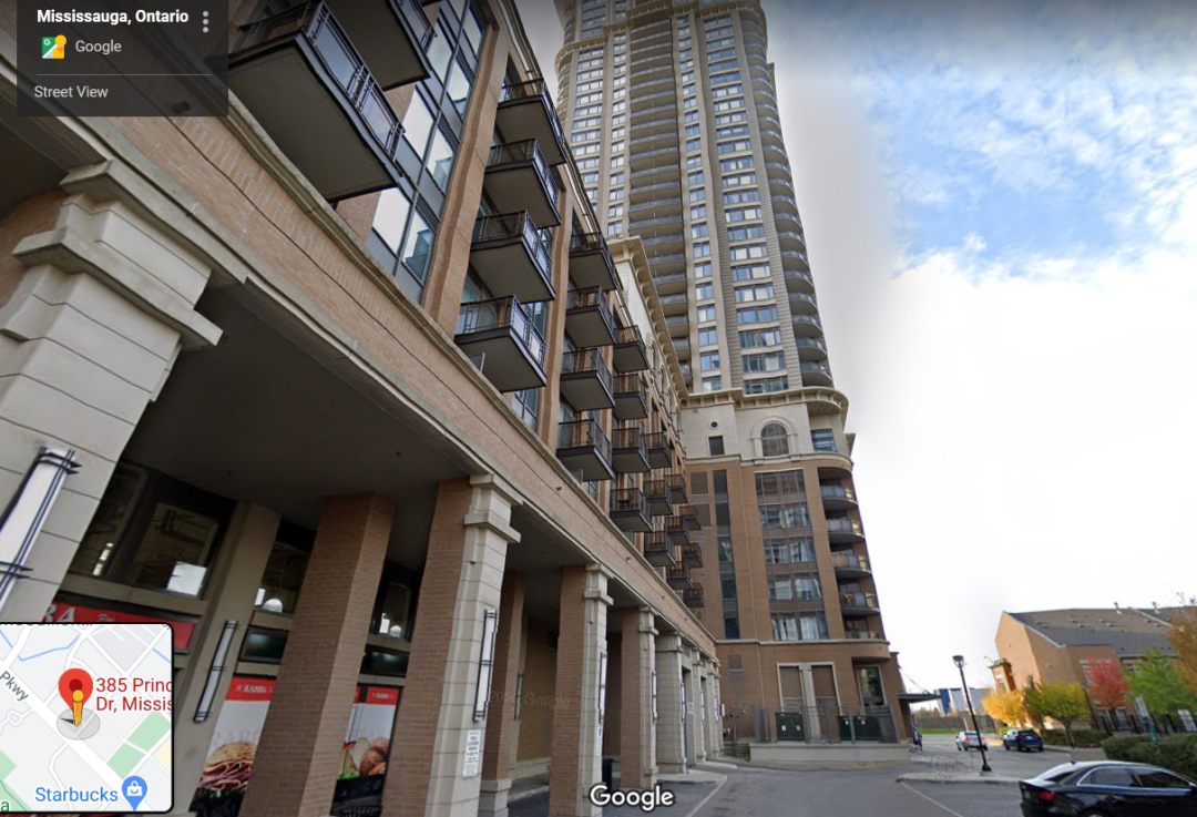这栋Condo就在密市购物商城Square One附近。地址是:385 Prince of Wales Drive, Mississauga。