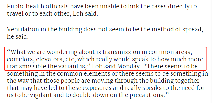 他说,公共卫生官员一直无法将这些病例和旅行相联系。而建筑物的通风似乎不是传染的途径,“我们需要尽快知道在大楼公共区域,比如走廊,电梯等的传染能力。这确实表明该变体病毒的传染性更高!”