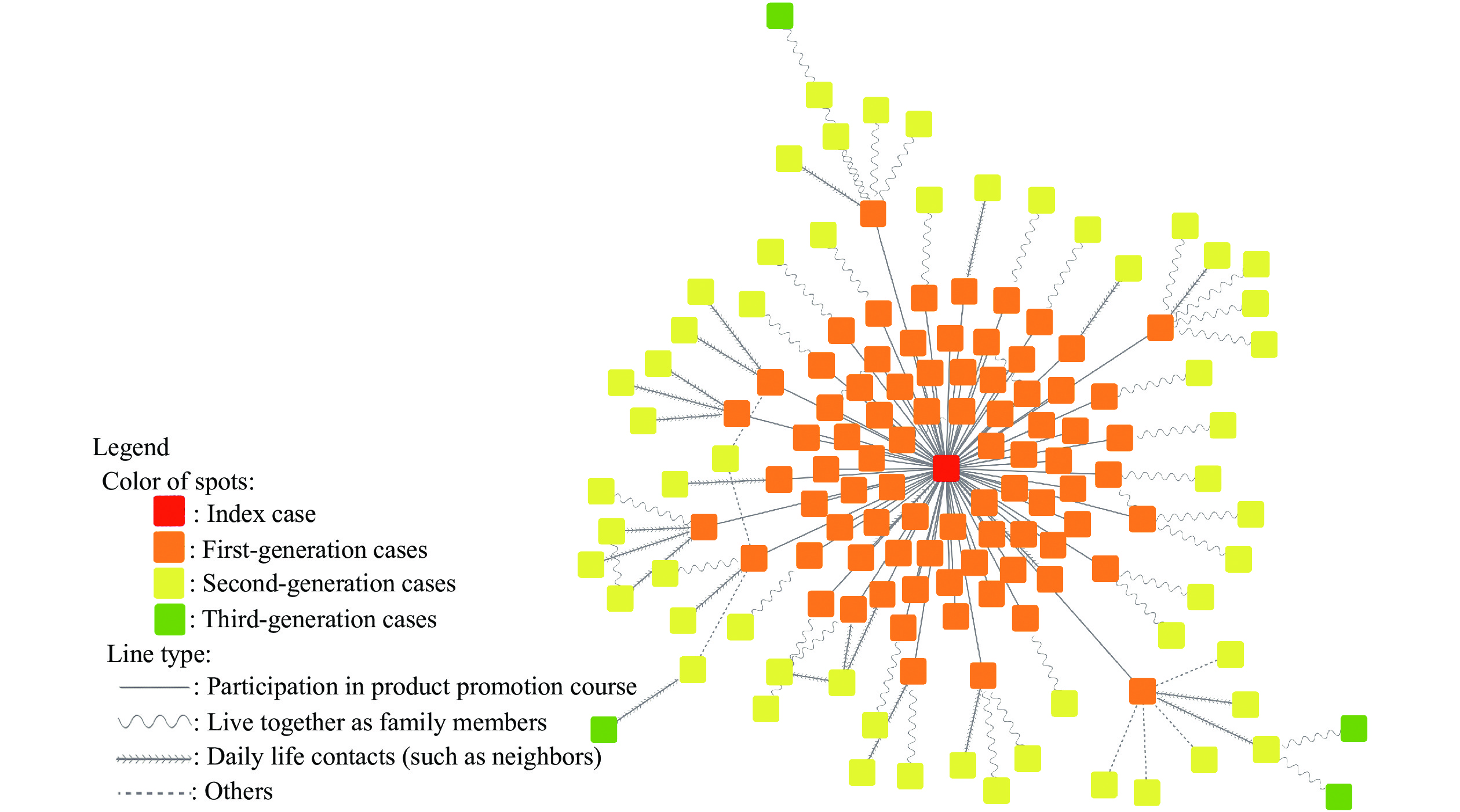 此外,L某还感染了至少7个其他接触者,包括地点A的5名员工(D女士在L某同在一个酒店,房间相邻;E女士是L某就餐餐厅的员工,L某在此吃了两次饭)。L某的亲密接触者在其他的讲座、购物和打麻将等过程中又传播了病毒。L某的亲密接触者共感染了30多个病例。总之,直到1月31日,L某直接在通化市东昌区感染了81个病例(第一代病例),并间接感染了至少60个病例(第二代和第三代病例)。