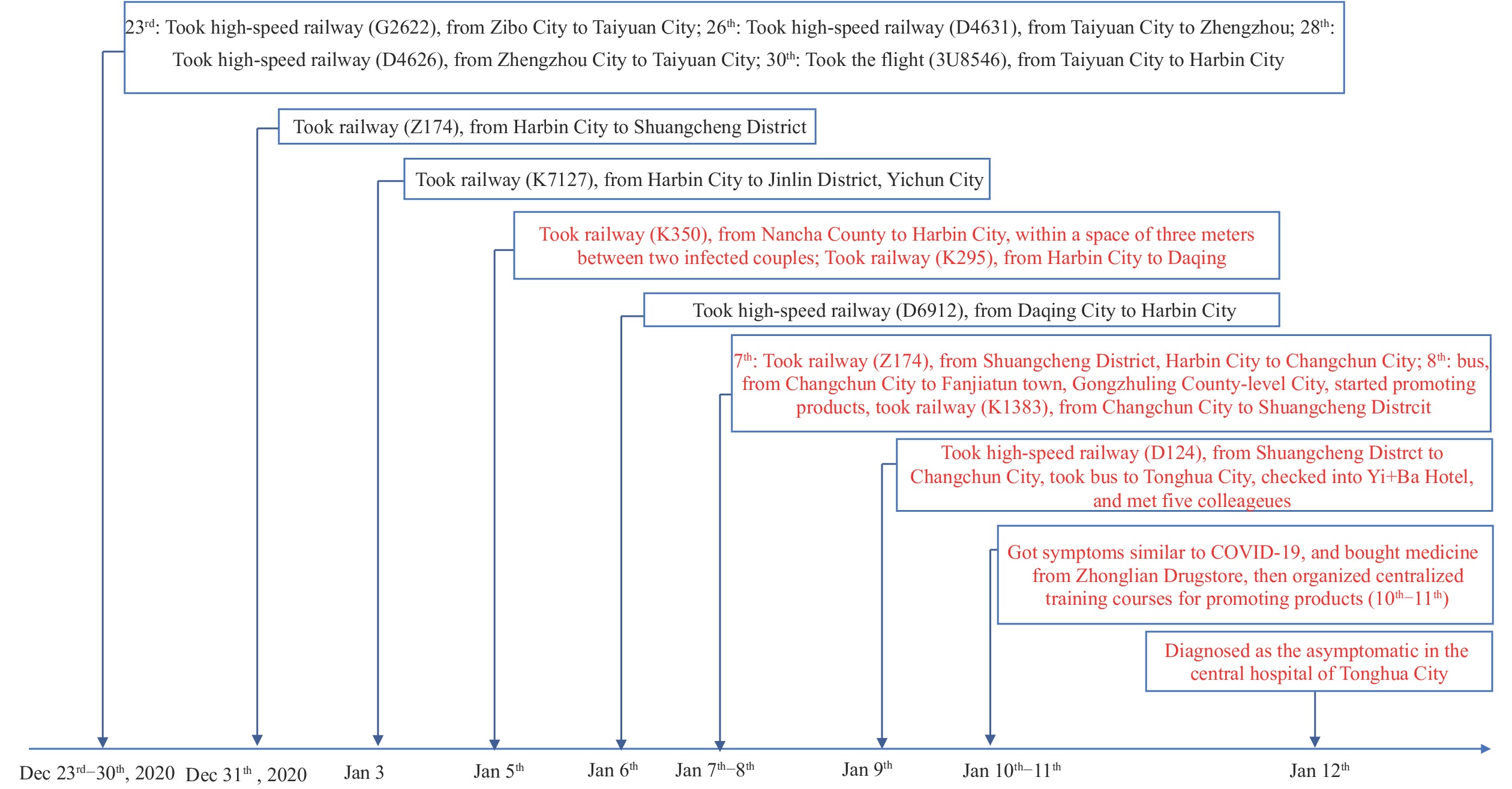 1月3日至6日,L某乘火车到达黑龙江省内;1月7日,他乘火车进入吉林省到达长春市。1月9日至12日,L某住在吉林省通化市,并主持产品推广培训课程。他在小餐馆就餐,并与外界接触。L某于1月5日乘坐K350火车,与黑龙江绥化市望奎县4例确诊病例中的2例相邻而坐。他于1月9日到达吉林省通化市,并在随后的2天里进行了3次培训。1月10日中午,由于肌肉疼痛和其他症状,L某去了一家药房(在药房测量时,他的体温在正常范围内)。