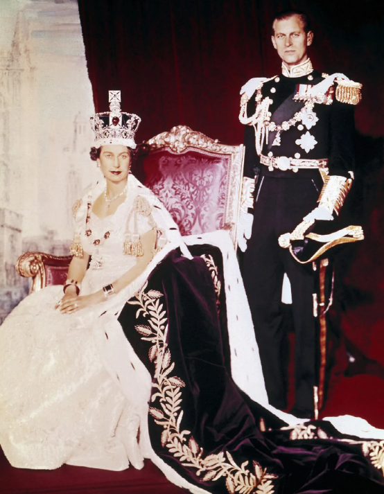 1953年6月,伊丽莎白公主在菲利普的陪同下在西敏寺加冕成为女王伊丽莎白二世,当时女王的加冕典礼也是全球首个电视转播盛会。同年,伊丽莎白女王还封菲利普为皇家海军元帅、英国陆军元帅和空军元帅,但直到1957年才获女王封亲王称号。