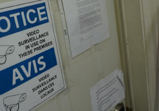 (Gilles居住的公寓门粘贴着探访规定和监视器提醒。图来源:CBC)