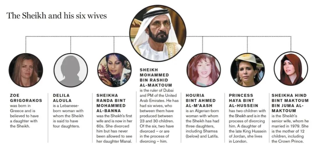 迪拜实行一夫多妻制,谢赫·穆罕默德拥有至少6位妻子,为他生下了30个孩子。