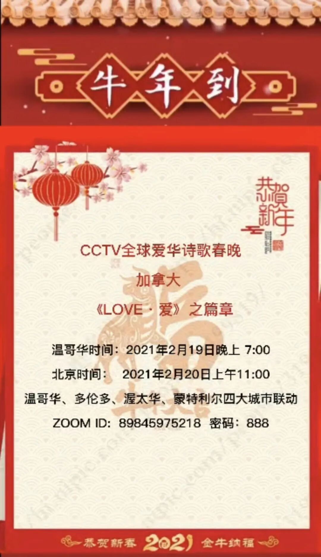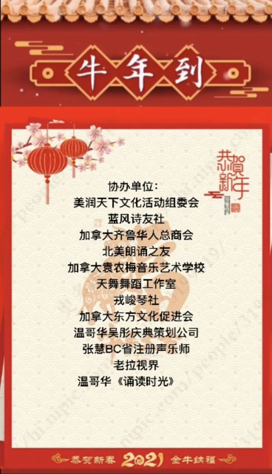 加拿大会场的晚会为温哥华时间2021年2月19日晚上的7:00(北京时间2月20日上午11点)。由温哥华、多伦多、渥太华、蒙特利尔几大城市的文学和演艺团体共同参与举行。