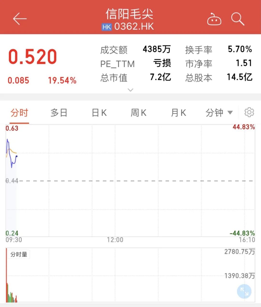 17日港股开盘,截至发稿,信阳毛尖已涨超19%,报0.52每股。
