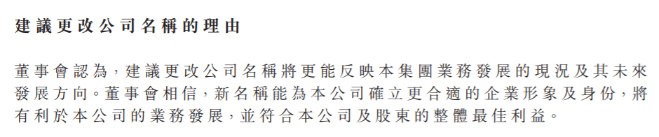 为什么要改名?董事会认为,建议更改公司名称将更能反映集团业务发展的现况及其未来发展方向。董事会相信,新名称能为该公司确立更合适的企业形象及身份,将有利于该公司的业务发展,并符合该公司及股东的整体最佳利益。