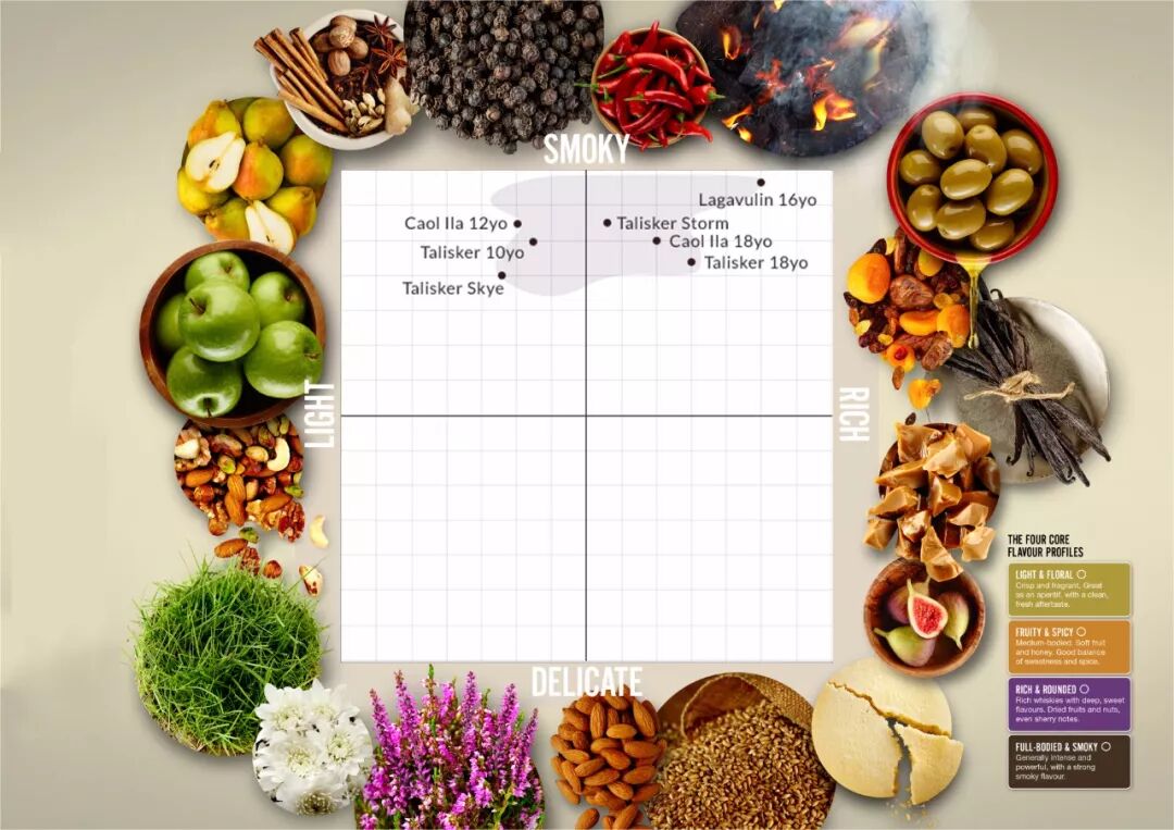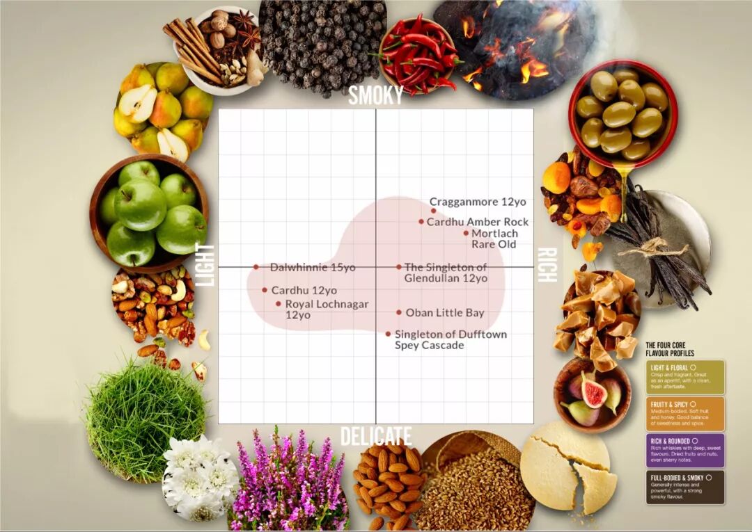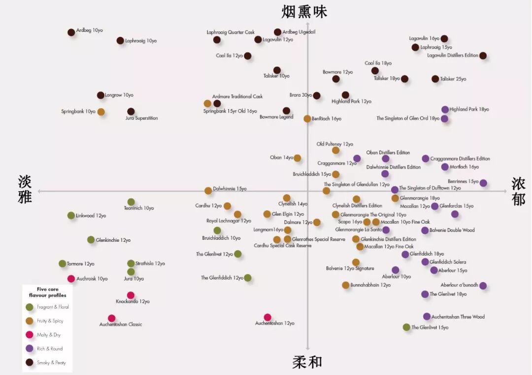 1、纵坐标的从柔和(Delicate)开始,代表着干净与纯净,这类威士忌通常在发芽过程中大都不会用到泥煤;